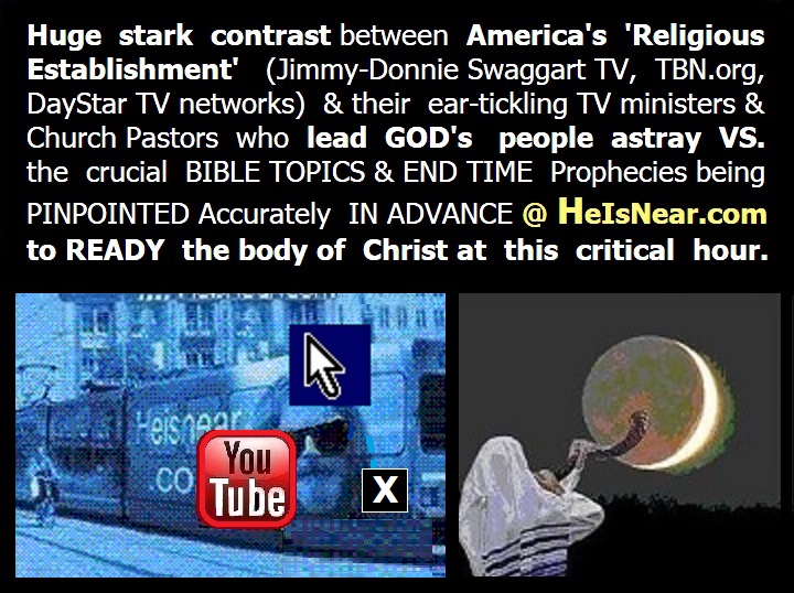 * Typically only LINKS (to contribute/support) are displayed in HeIsNearCom's social networks showing simply 'how to support' this ministry & NEVER any money-raising gimmicks or constant 'Praise-A-Thons' as seen at TBN & DayStar & J. Swaggart TV. ( IE. Jimmy Swaggart & son Donnie offer their autographs in a Bible for $1000 offering, ETC ).